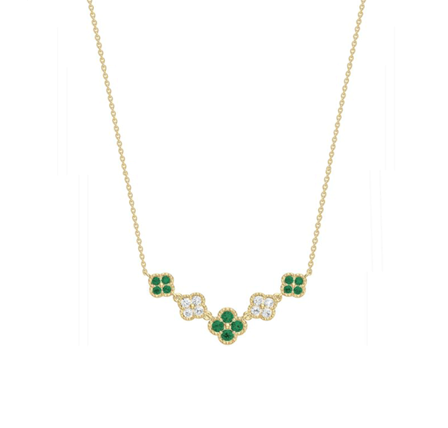 14k gold necklace, alternating .21cttw of diamonds and .25cttw of emeralds bezel set into a delicate clover pattern