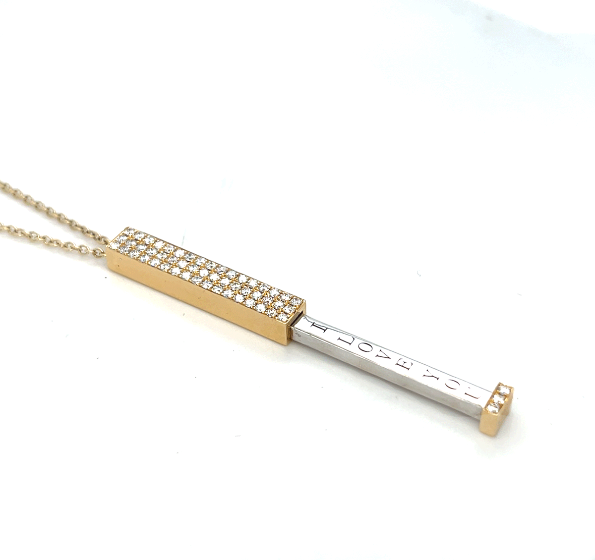 14k yellow gold .63ctw pave’ bar necklace, with a hidden “I love you” message