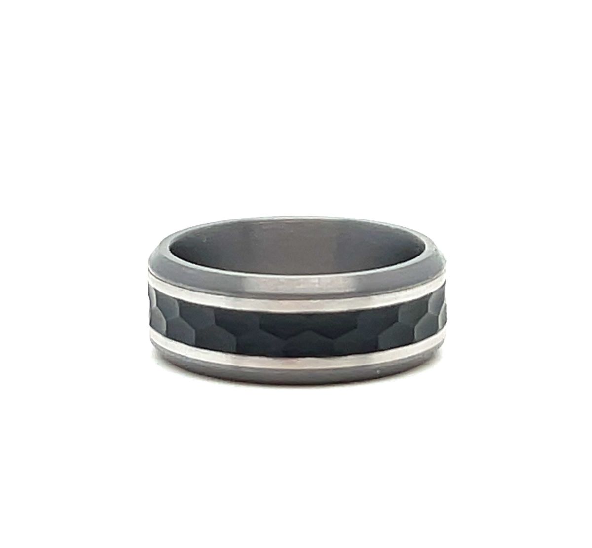 8mm ring with a 5mm tantalum center inlay, bordered by 14K gold edges. A clean, modern design with enduring appeal.