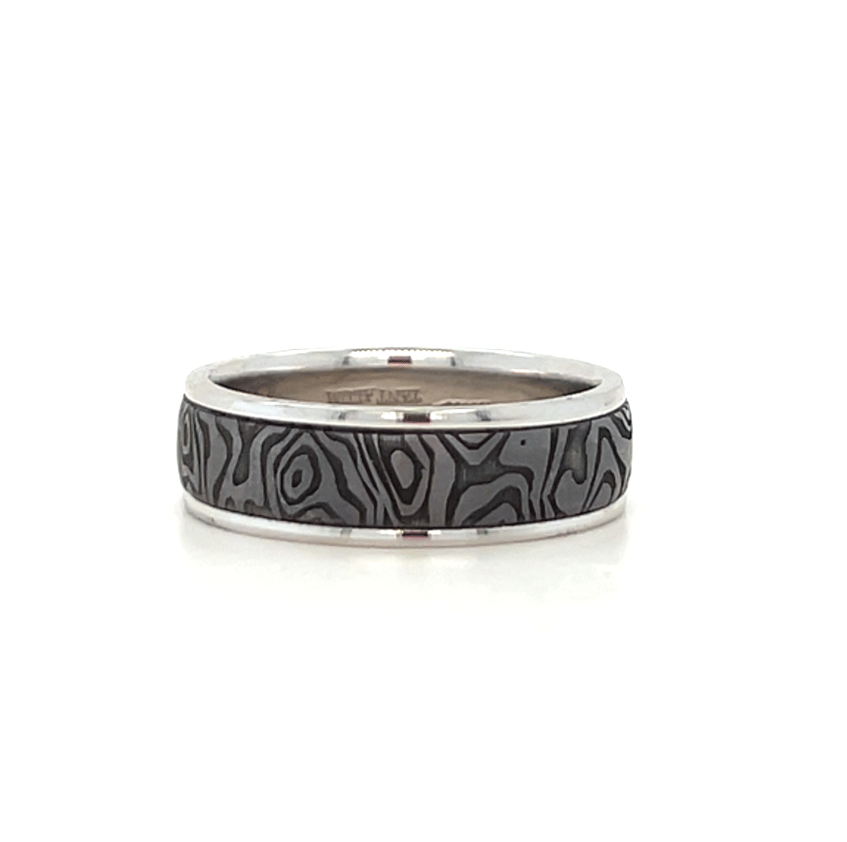 14k white gold 6.5mm wide band with a patterned Tantalum center