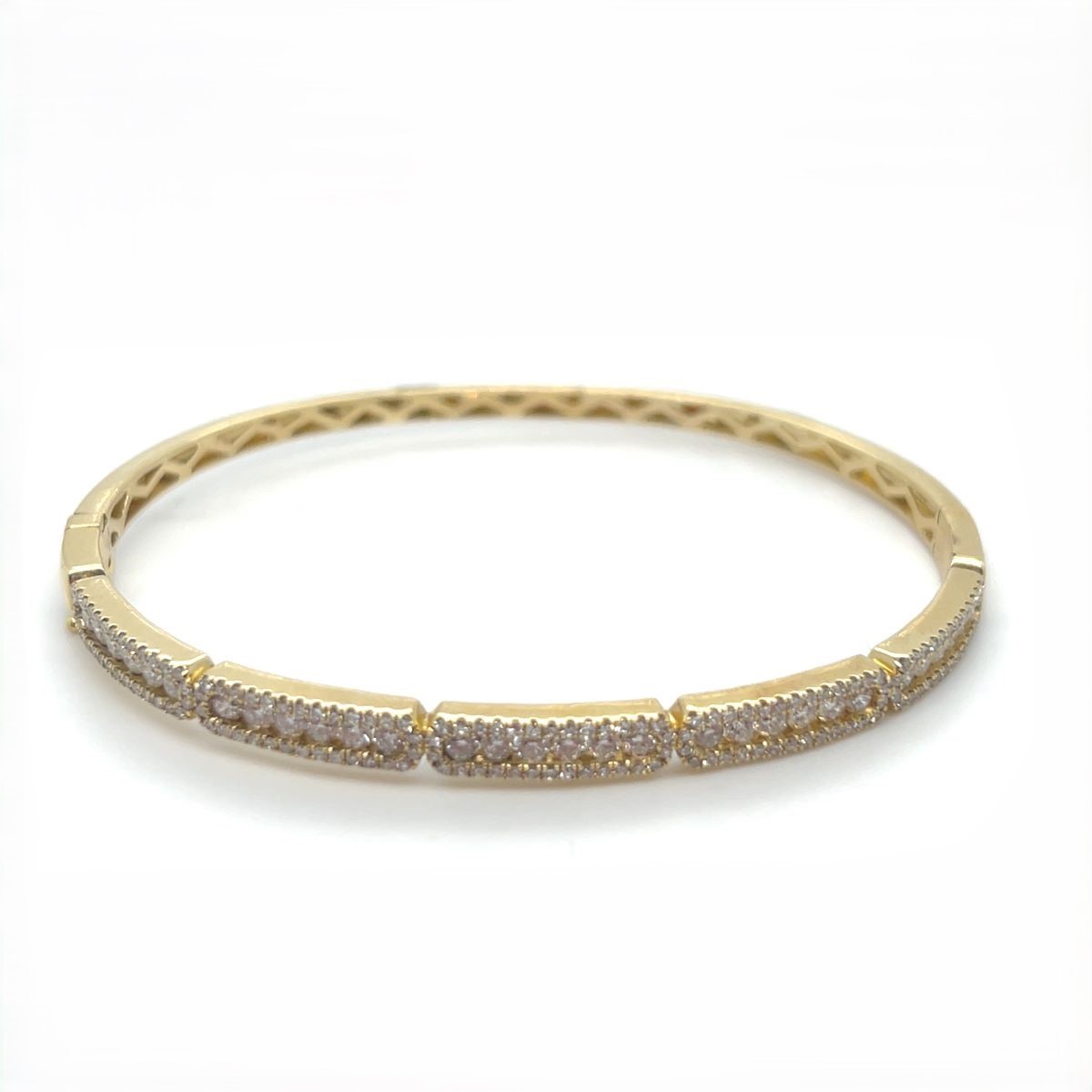 Crafted in 14K yellow gold, this elegant bangle is adorned with 180 round diamonds totaling 1.68 carats. A timeless piece that combines classic sparkle with refined sophistication