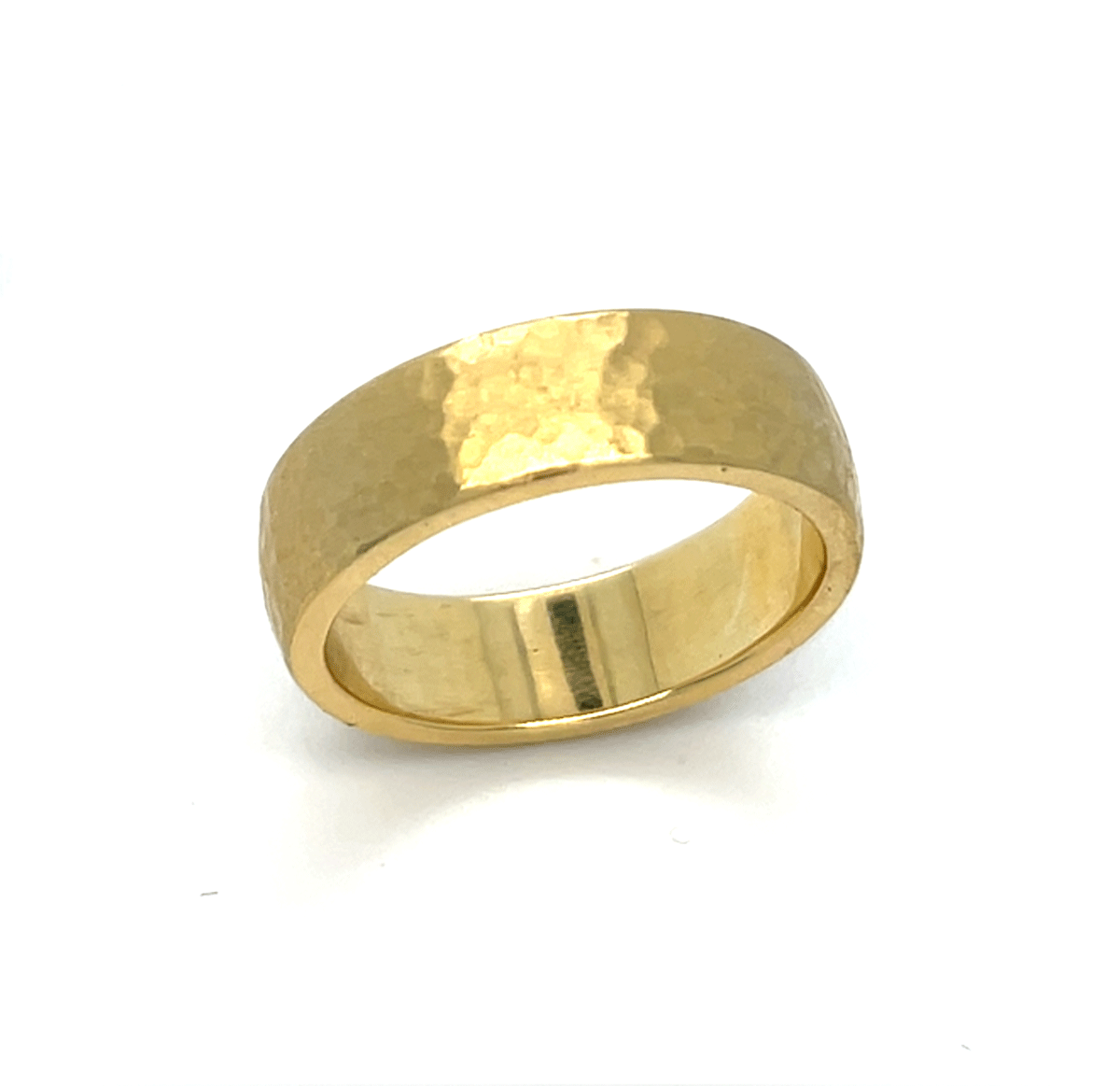 18k yellow gold, 6mm wide wedding band, with a hand hammered texture