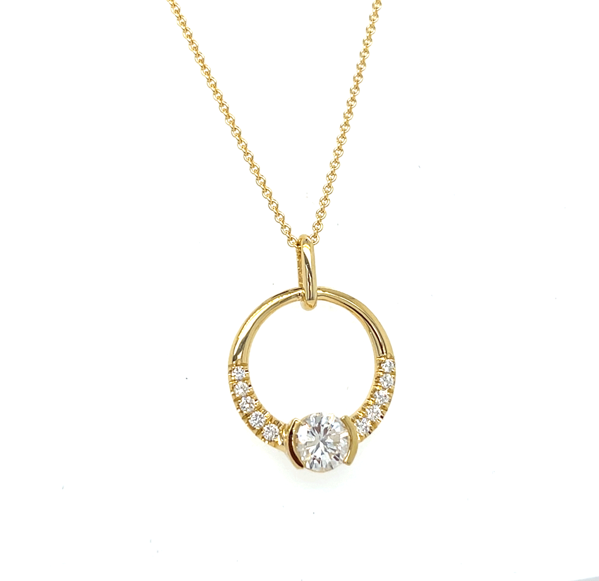 18k gold circle pendant showcasing a.80 carat round brilliant cut diamond, accented by .16cttw of pave’ set accent diamonds