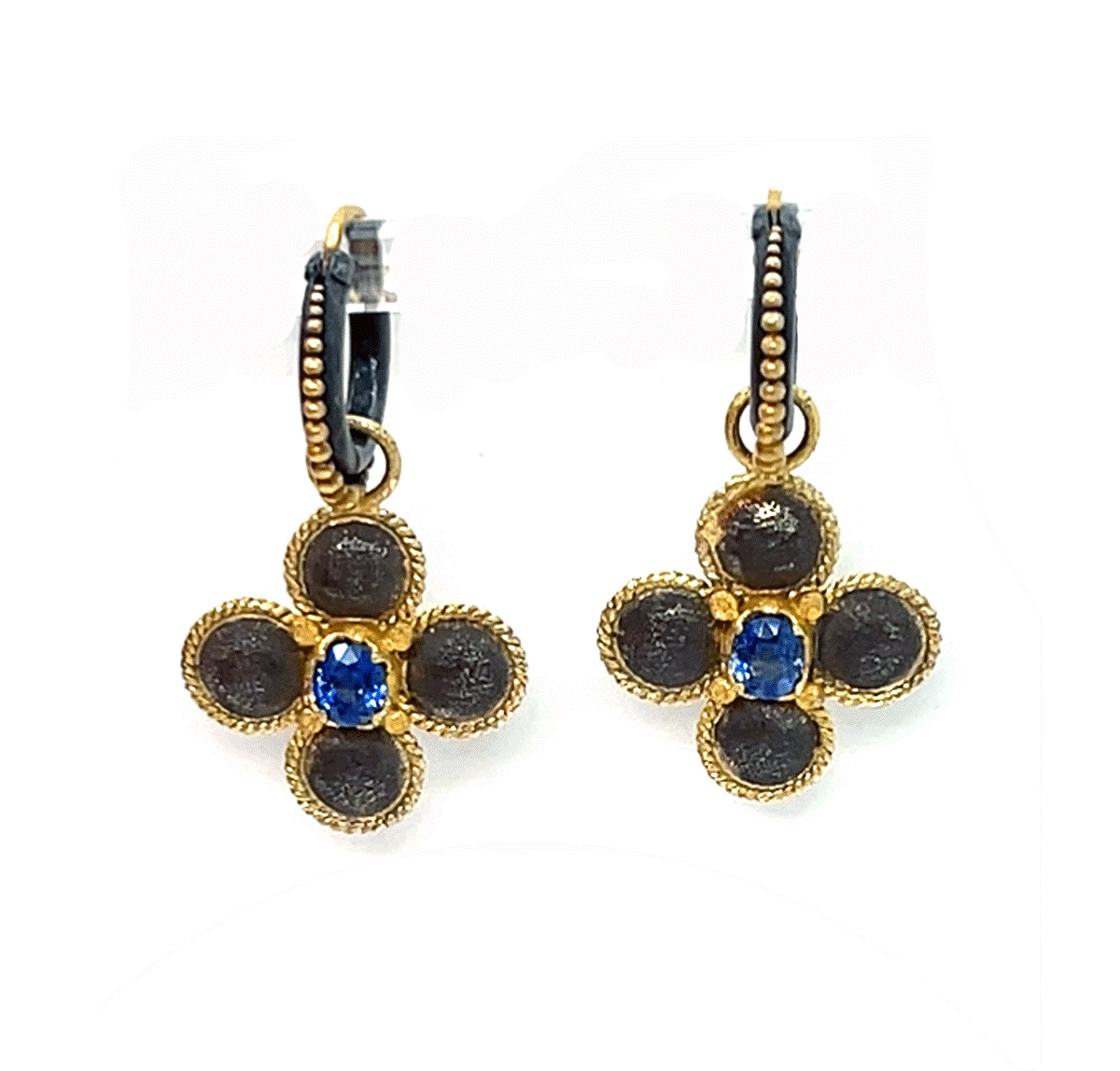 18k gold and oxidized sterling silver huggie hoop earrings with sapphire accented clover drops, by Carolyn Tyler