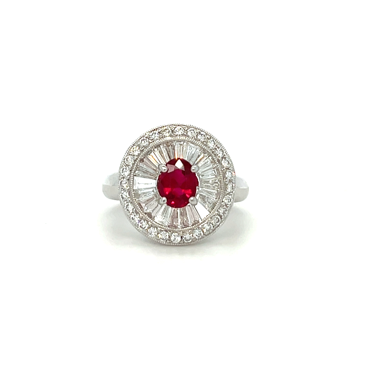 An elegant 18K white gold spoke-design ring featuring a vivid 1.00ct oval ruby at its center. Accented with .36ctw round diamonds and .89ctw baguette diamonds, this piece offers a striking balance of brilliance and bold color.