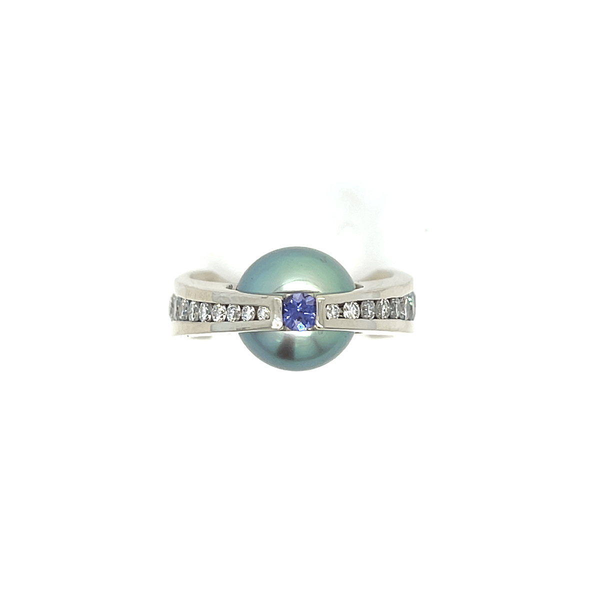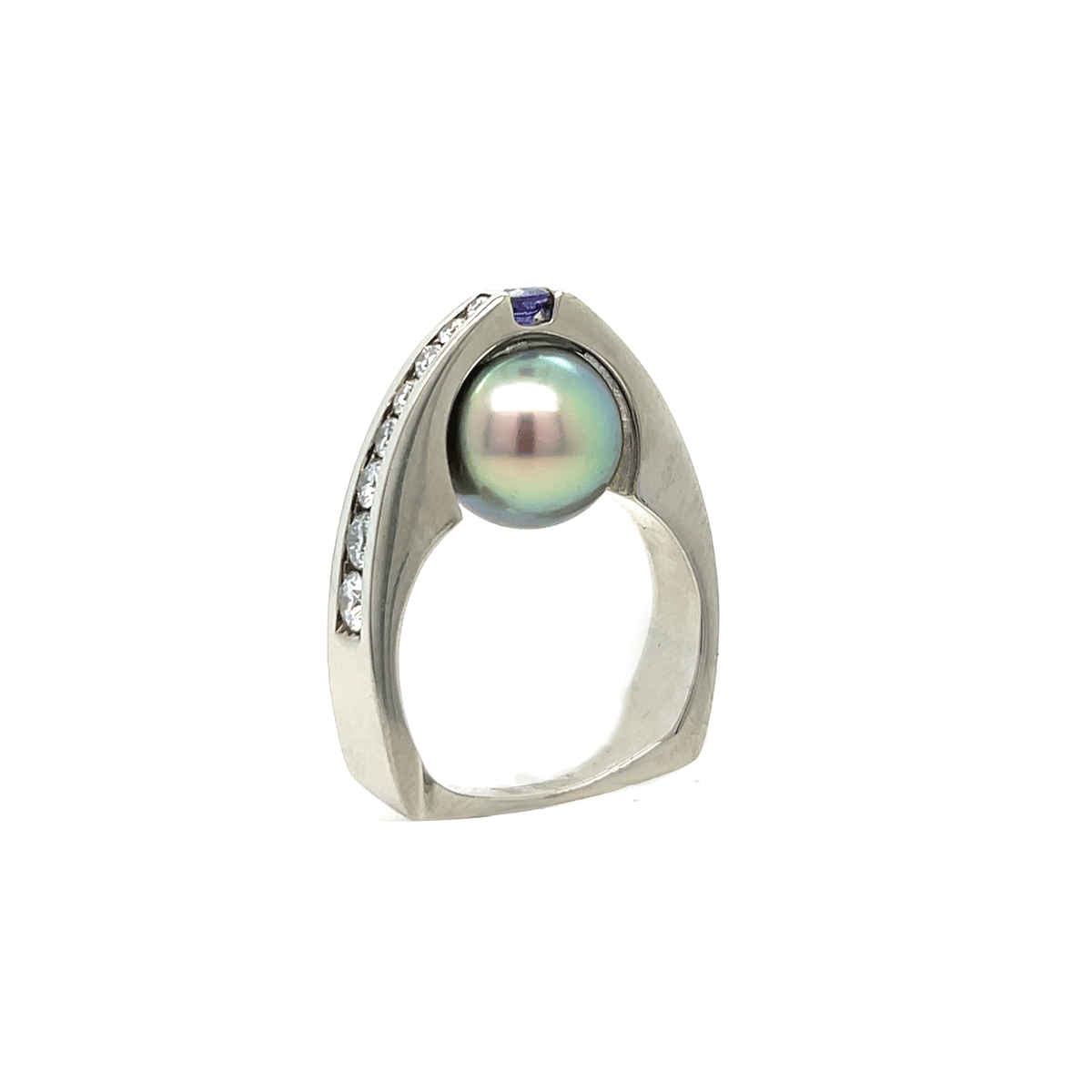 An elegant 18K white gold ring featuring a 10.7 mm black pearl, accented with 0.88ct total weight diamonds and a 0.18ct purple sapphire, designed by Brad Weber.