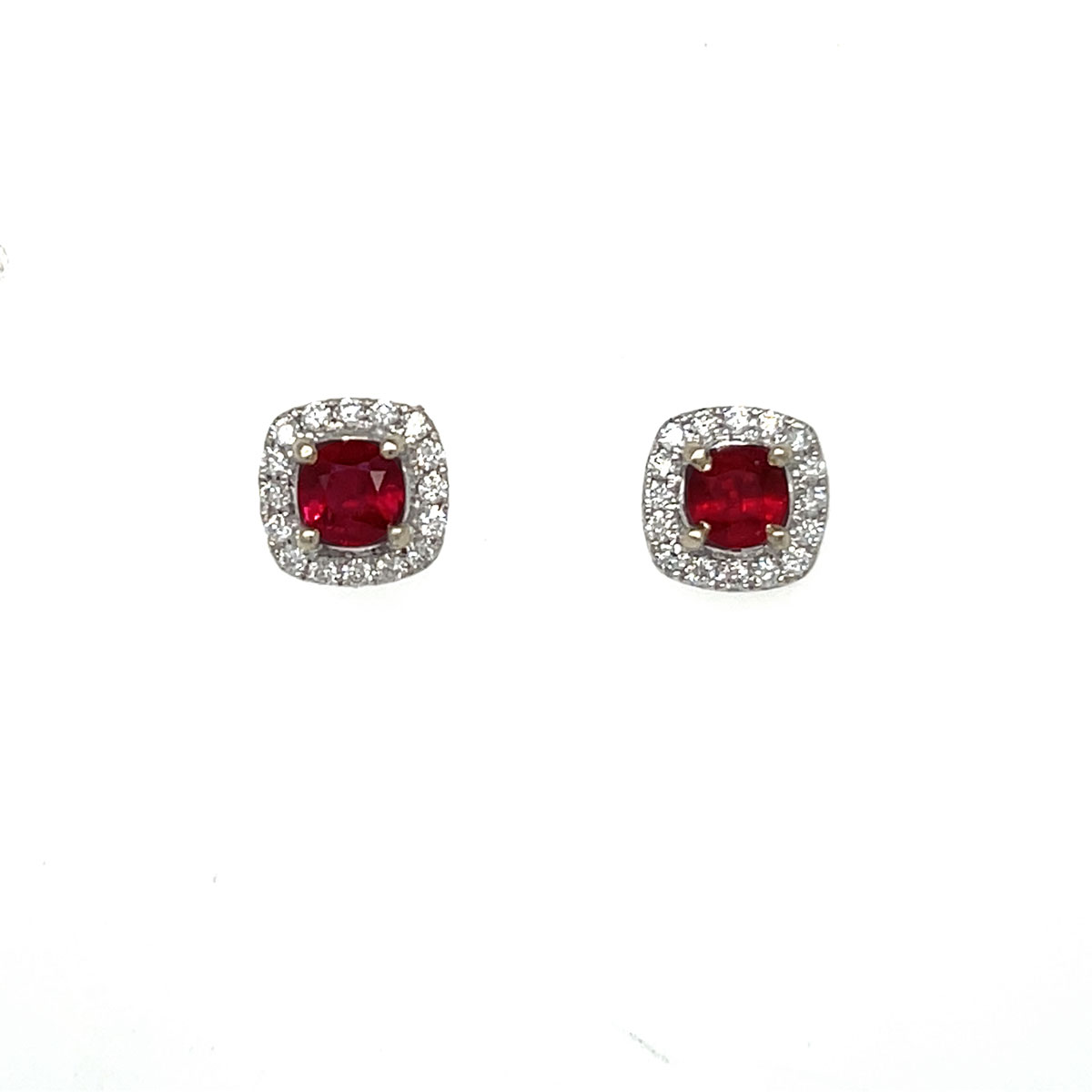 Beautifully crafted in 18K white gold, these earrings showcase cushion-cut rubies totaling 1.25 carats, accented by a delicate halo of sparkling diamonds totaling 0.26 carats. A classic and elegant choice for everyday luxury or special occasions.