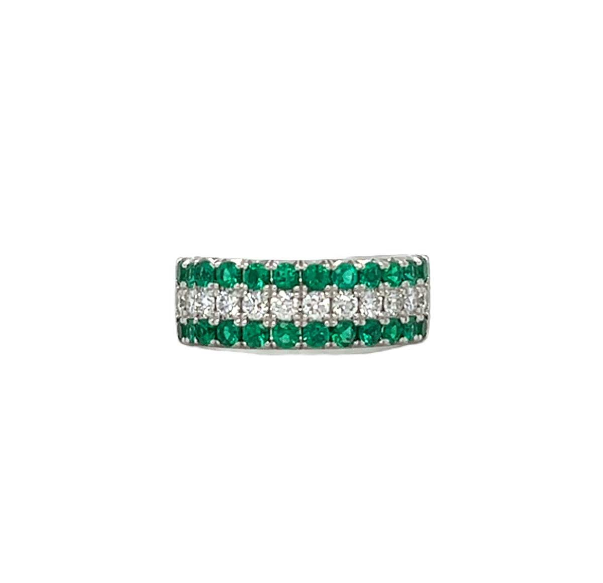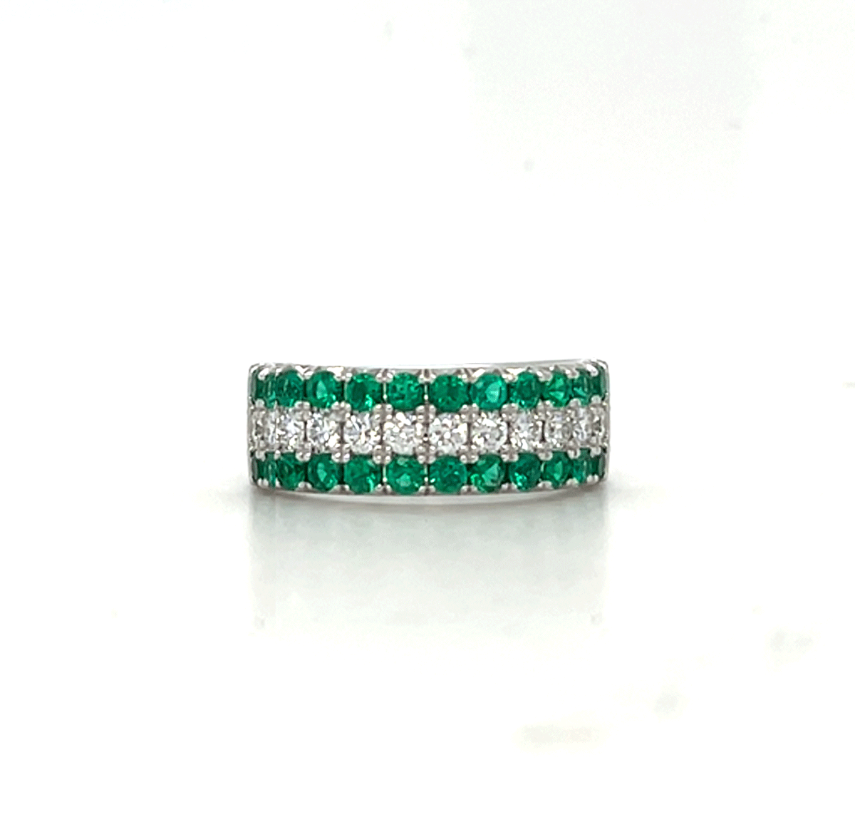 18k white gold 6.5mm wide band set with .44cttw of diamonds and 0.66cttw of emeralds