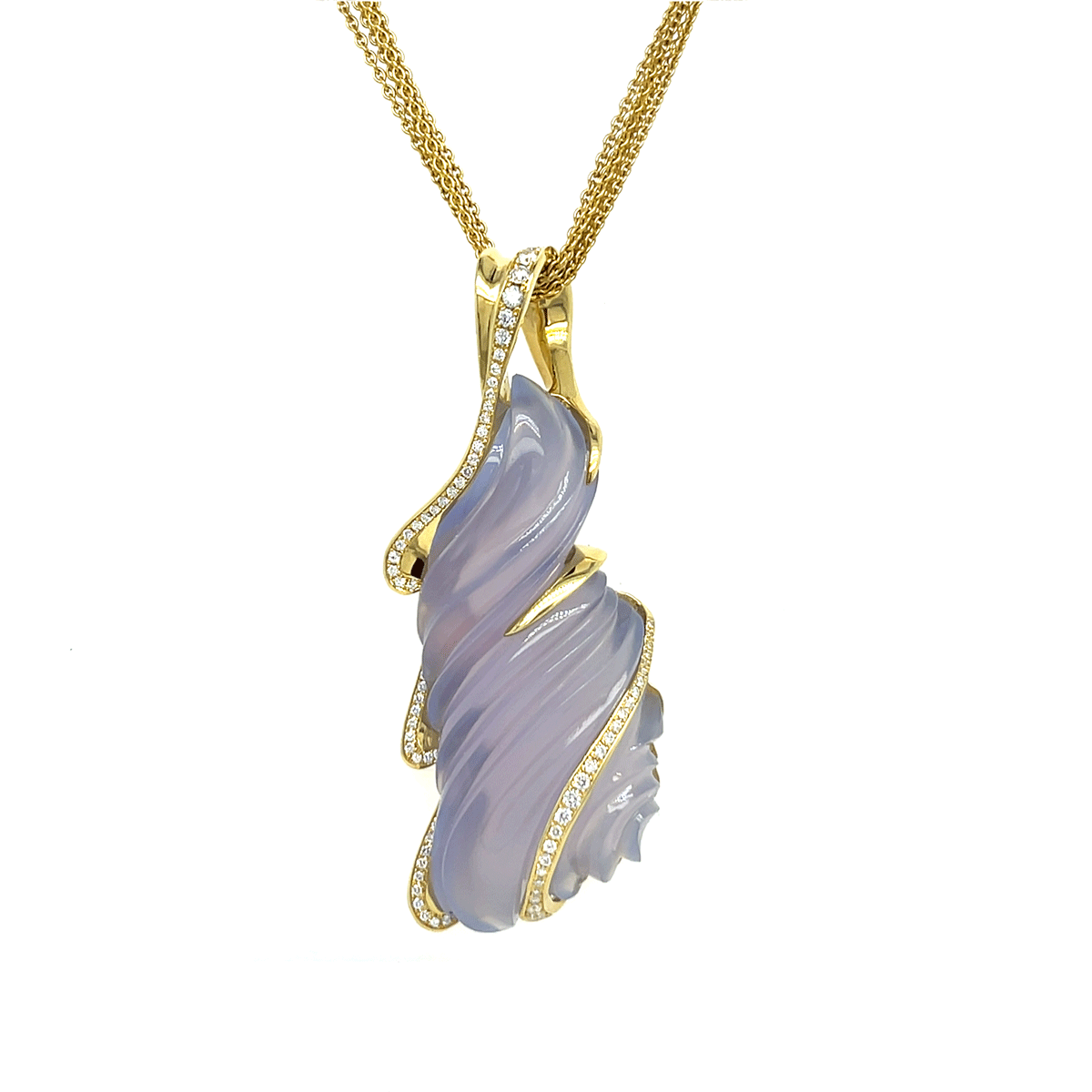 A beautifully crafted 18K gold pendant featuring freeform chalcedony and 119 round brilliant diamonds totaling 0.78 CTW for a luxurious finish, designed by Brad Weber.