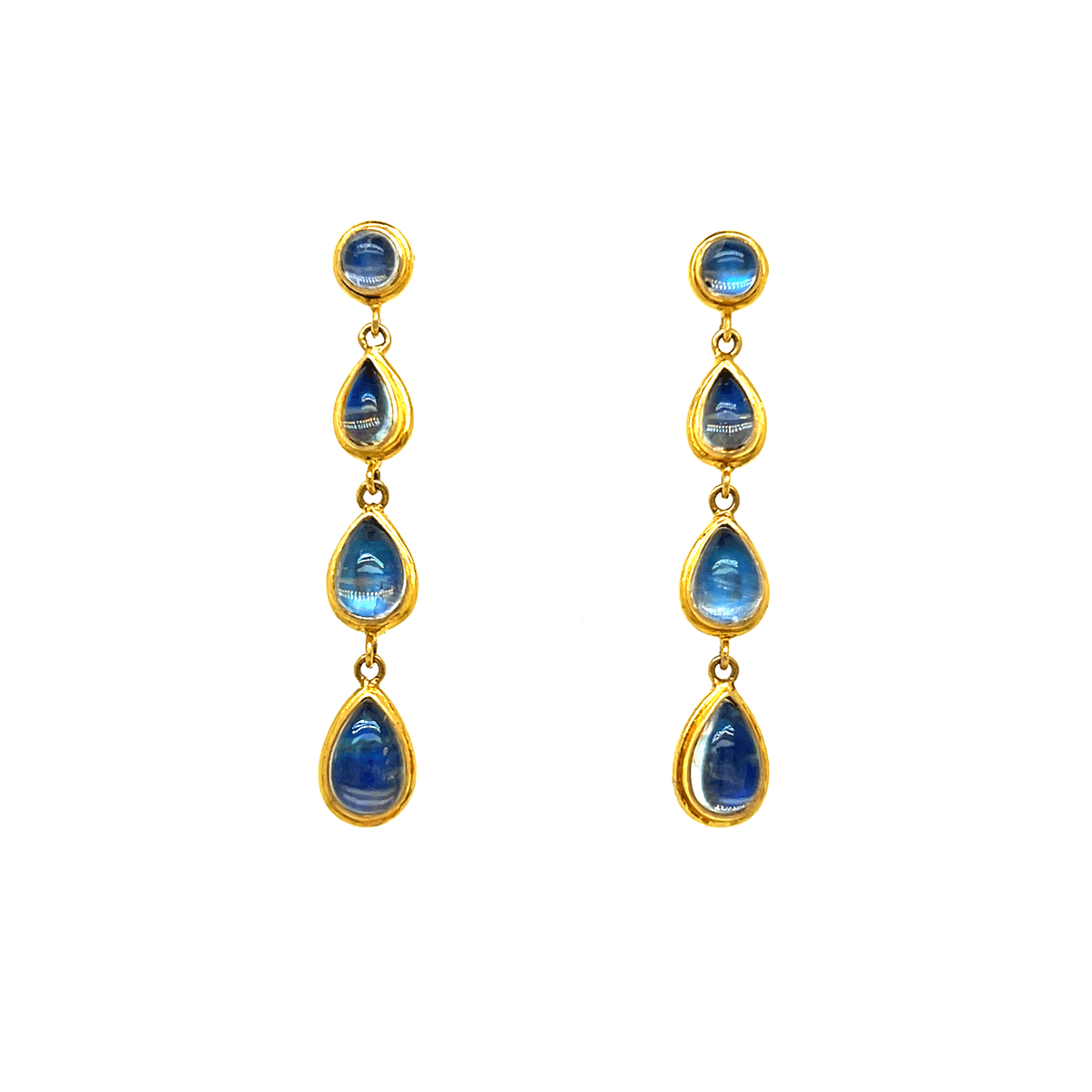 Elegant multi-drop earrings crafted in 18K yellow gold, featuring luminous moonstones totaling 5.0 carats.