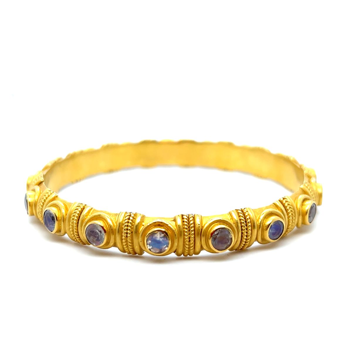 This sumptuous 22k gold “Chevron” bangle bracelet is set with 8.5 carats of faceted rainbow-hued moonstones (17 pieces total)