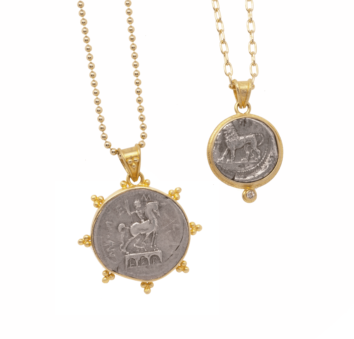 Ancient Roman coin pendants, set in rich 18k matte gold. Available in a variety of different certified and dated ancient coins.