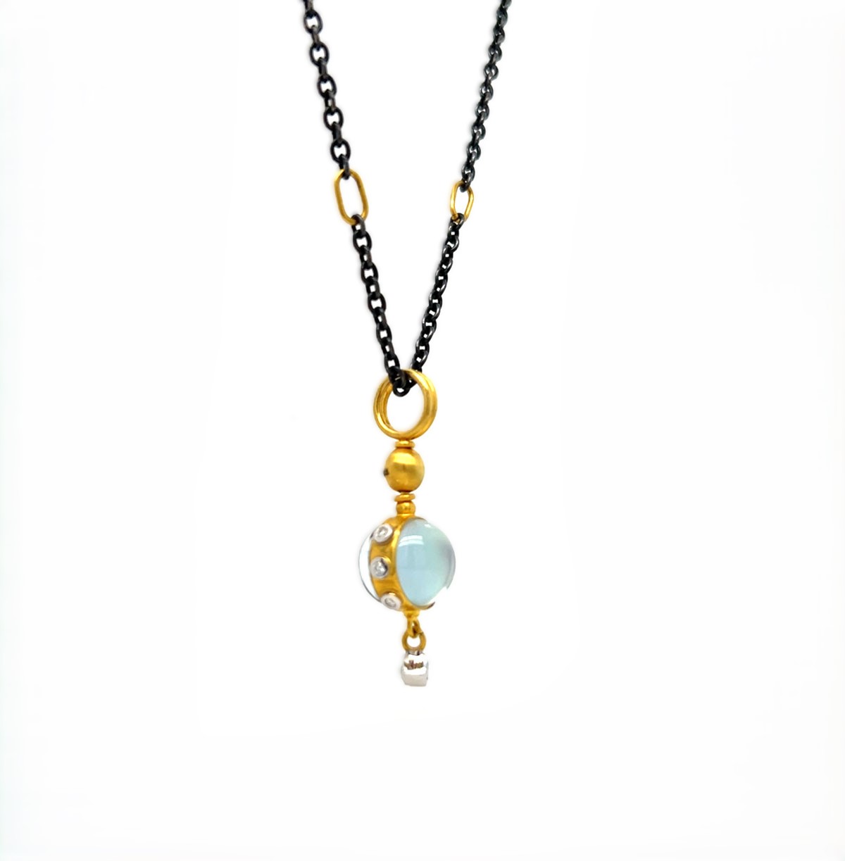 An elegant day-to-night pendant crafted in 24K yellow gold, featuring a polished cabochon onyx layered with luminous mother-of-pearl and crystal quartz. Finished with 0.19 carats of diamonds set in 18K white gold, this piece blends bold contrast with refined sophistication.