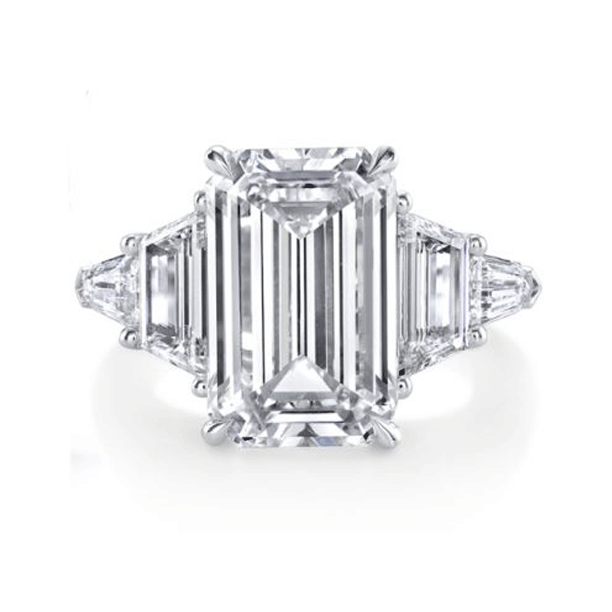 Platinum ring featuring a 7.07 carat emerald cut diamond of I color and VS2 clarity, GIA certified, flanked by 1.02cttw of trapezoids and .70ctw of bullet diamond side stones