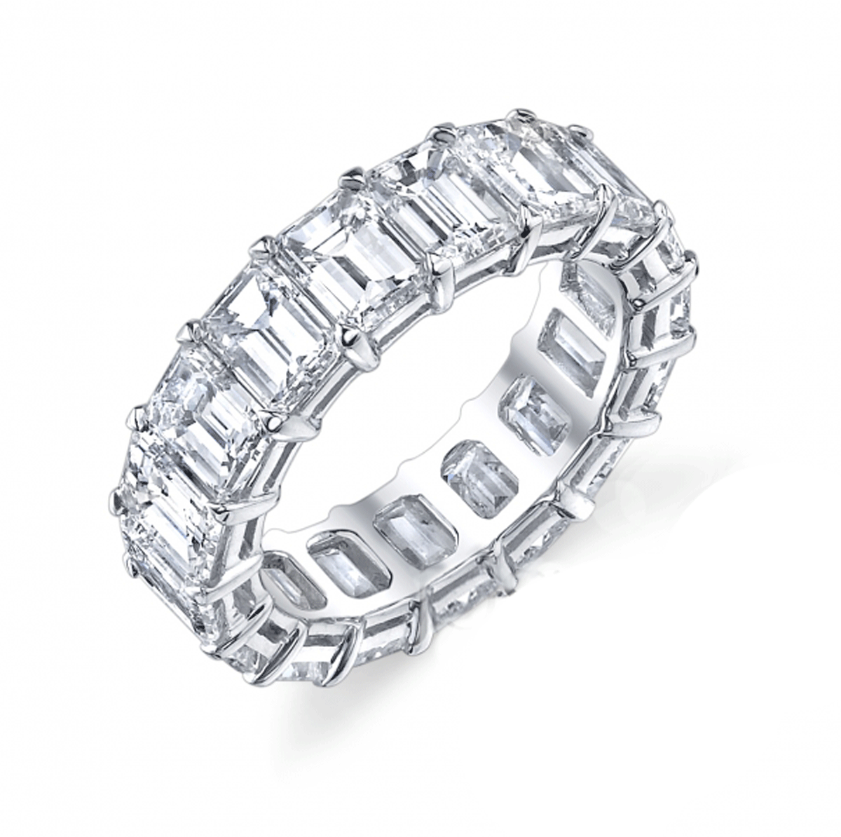 Platinum eternity band with 17 emerald cut diamonds of F-G color and VS clarity weighing 8.73cttw