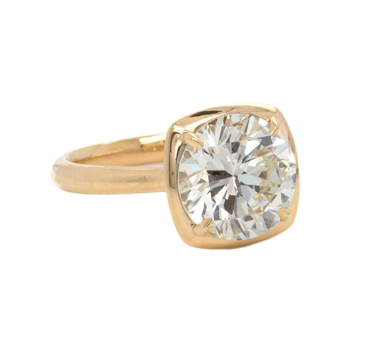 18k yellow gold custom design cushion shaped bezel ring for a 3.46ct round brilliant cut diamond, N/ SI2 , G.I.A certified.