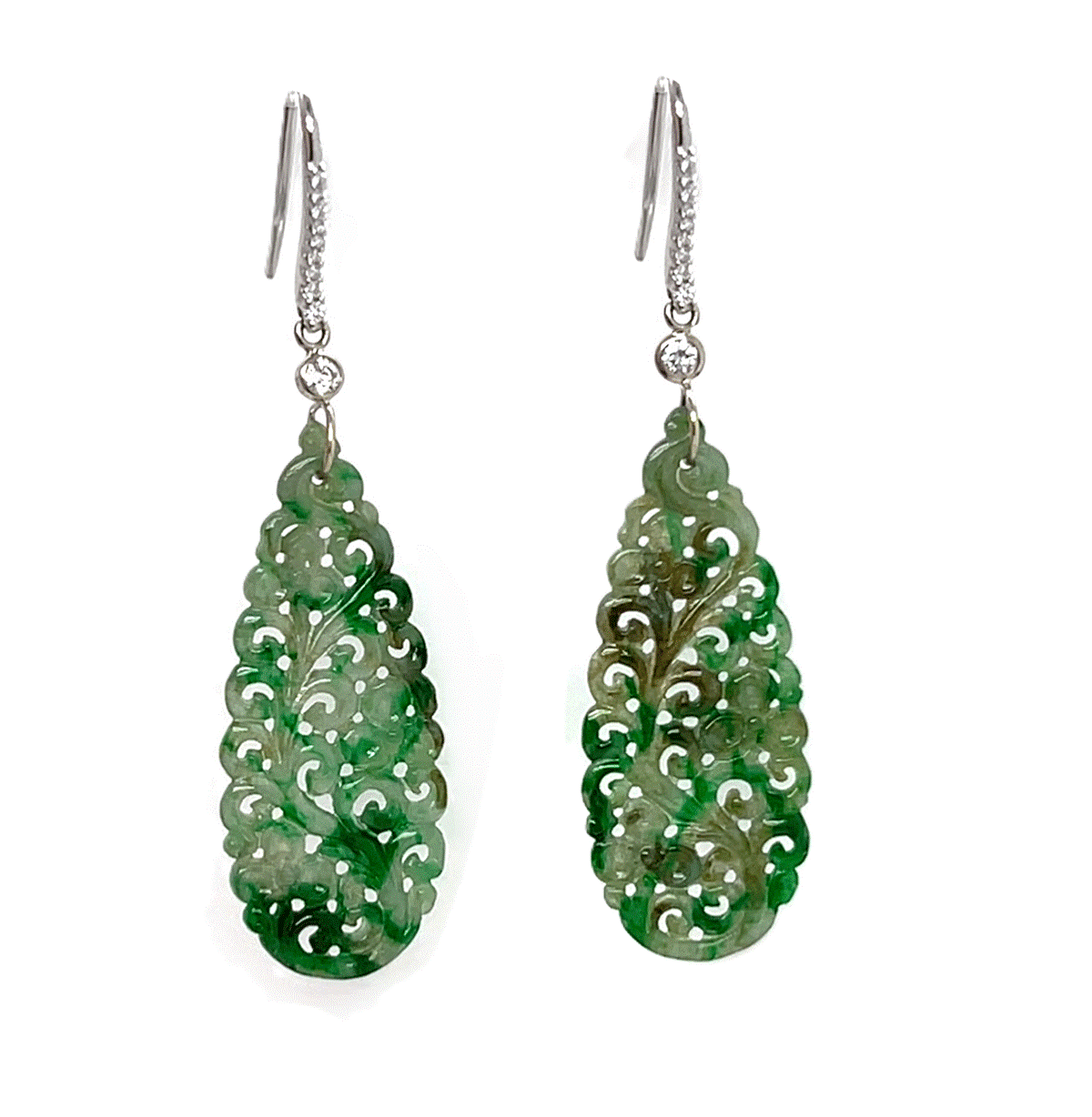 14k white gold carved lacey jade slice with pave diamond french wire earrings