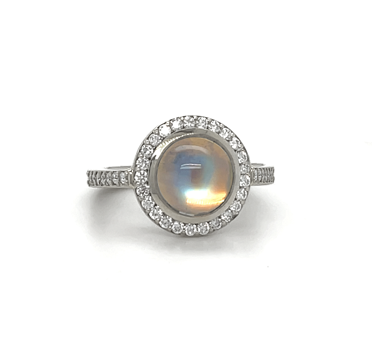 Rainbow Moonstone Pavé Halo Ring by Brad Weber