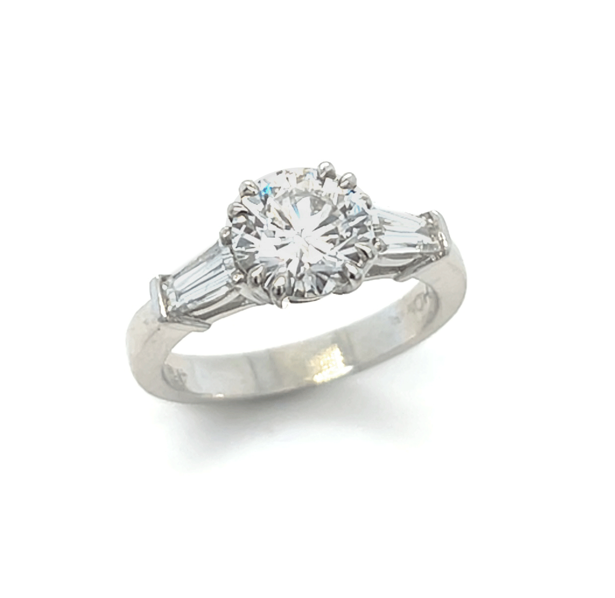 Platinum 3-stone ring showcasing a 1.52ct F/VVS2 GIA certified center, accented by 0.54cttw of baguette side diamonds