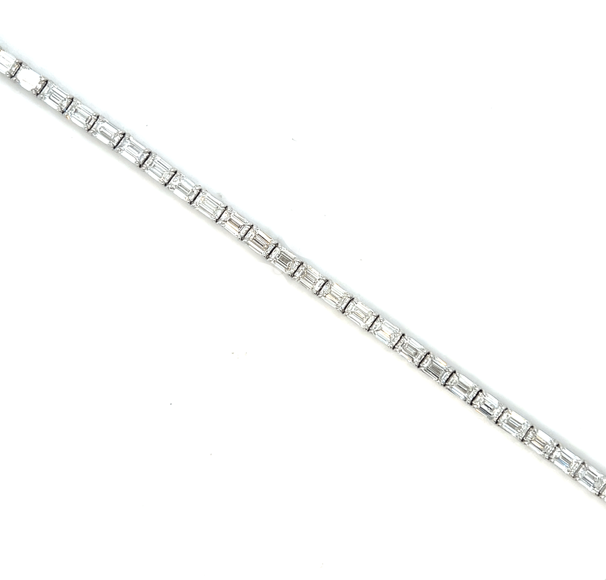 Exquisitely crafted in platinum, this east-west tennis bracelet features 37 emerald-cut diamonds totaling 11.36 carats—a striking blend of modern orientation and timeless elegance.