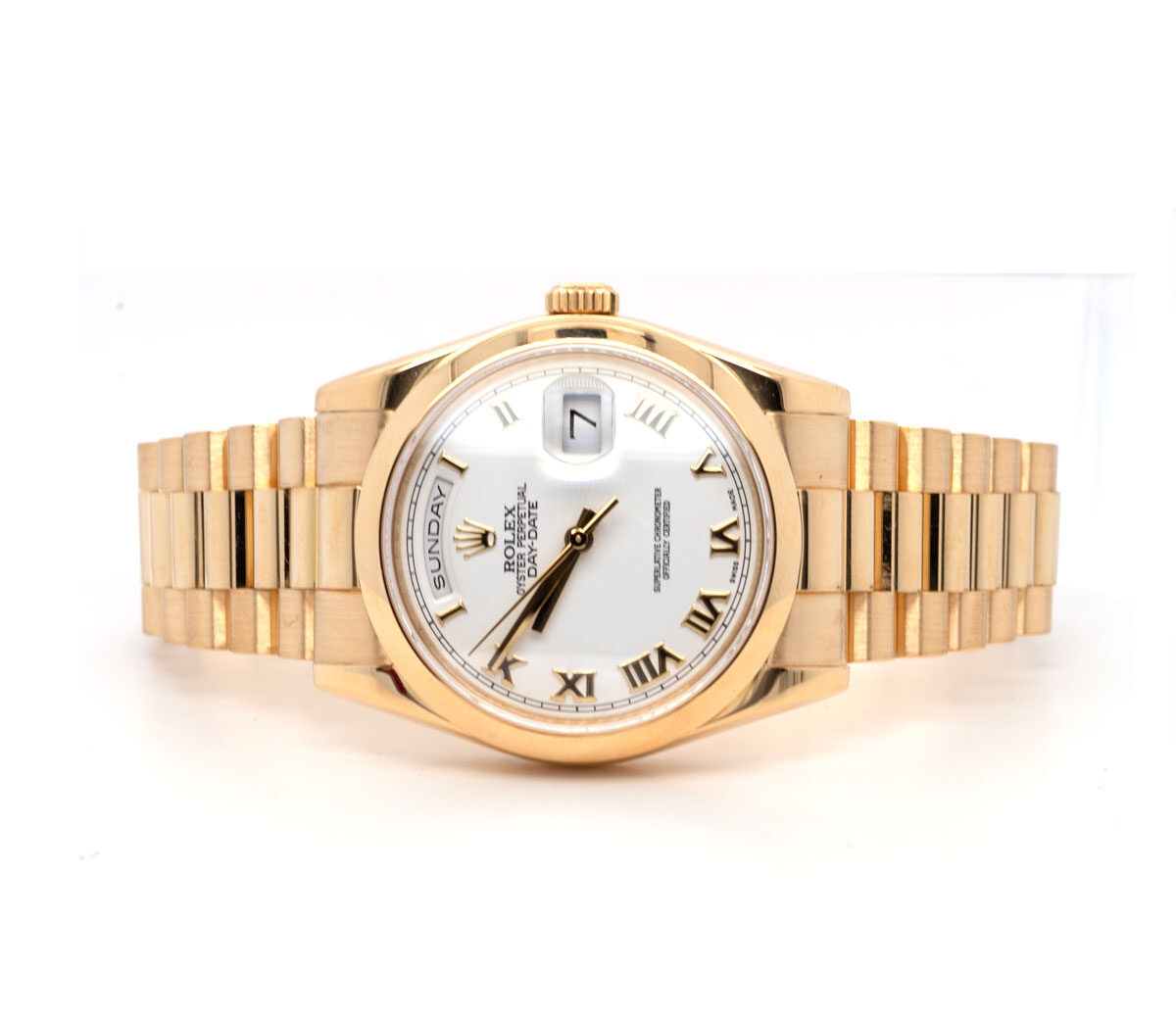 Pre-owned Rolex Daydate 36mm 18k gold watch with white Roman dial model 118208